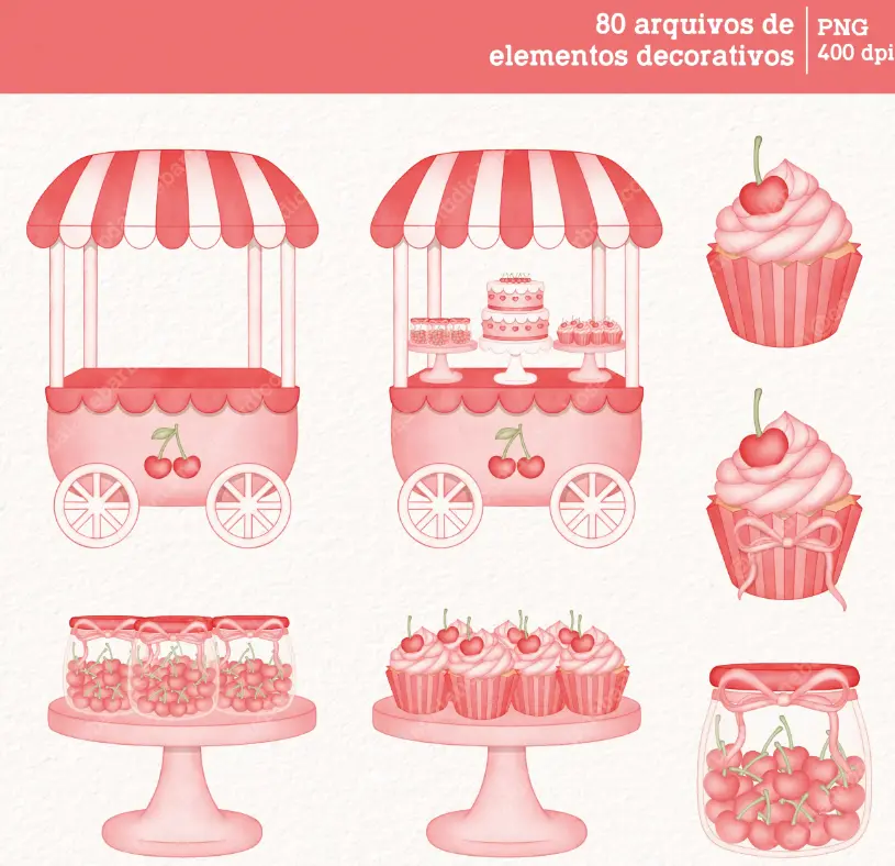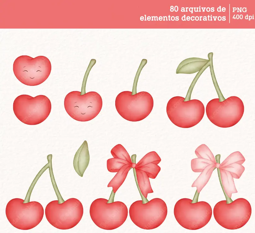 Inspire-se com o encanto delicado das cerejas em aquarela, capturadas em elementos graciosos que trazem frescor e charme aos seus projetos criativos. Este conjunto oferece uma seleção cuidadosamente elaborada para enriquecer trabalhos manuais e composições visuais.