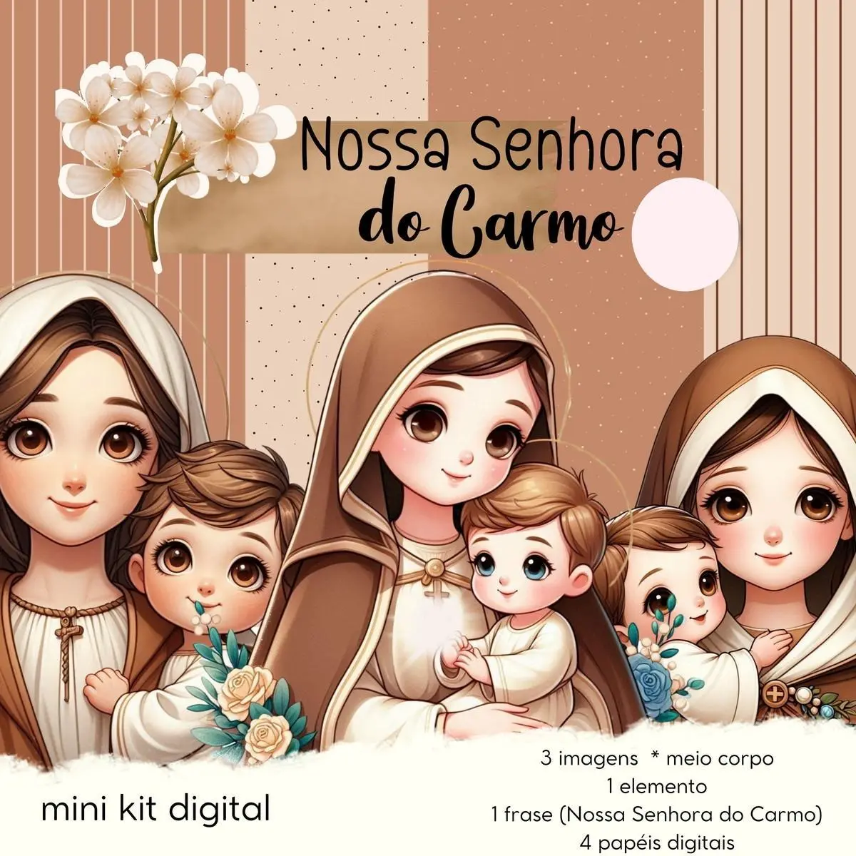 Kit digital de Nossa Senhora do Carmo com santinhos em PNG para criar lembrancinhas personalizadas e artigos religiosos com alta qualidade.